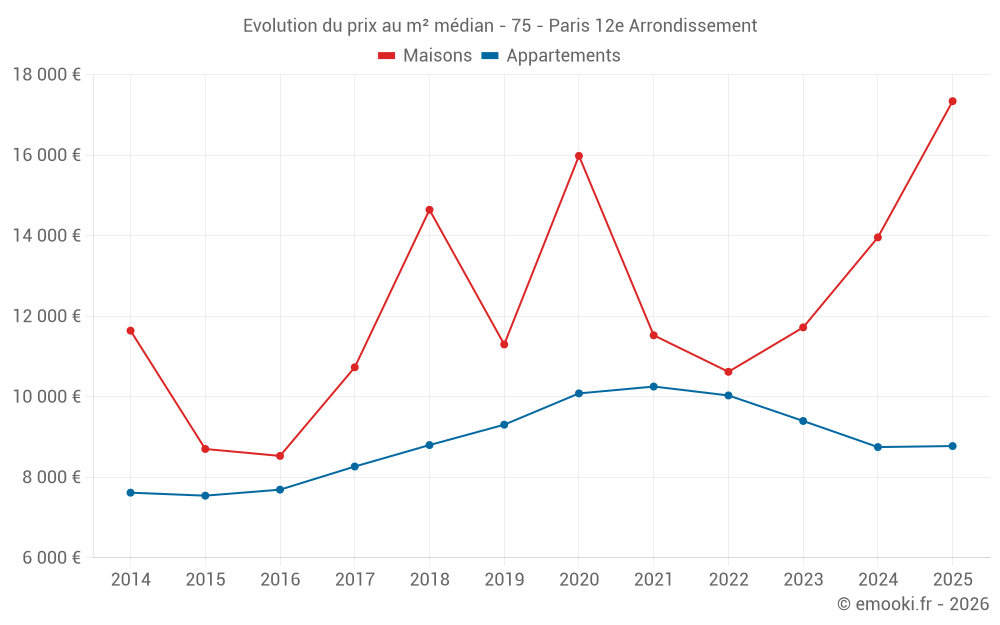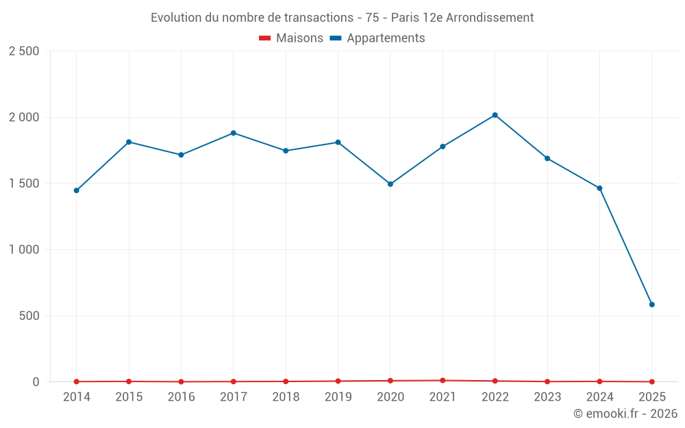 Le prix médian sur les 139 transactions d'appartements des 3 derniers mois dans la commune de Paris 12e Arrondissement était de 8 740 € par mètre carré pour une valeur foncière médiane de 330 000 €. Sur cette période 60% des transactions se sont situées entre 7 438 et 10 420 € par mètre carré (du 2ème au 8ème déciles).