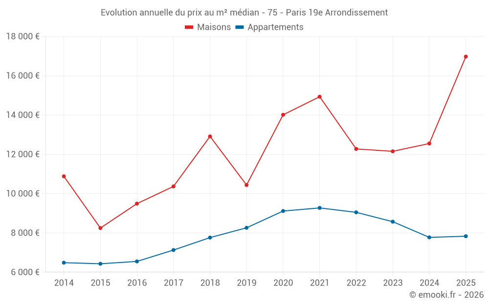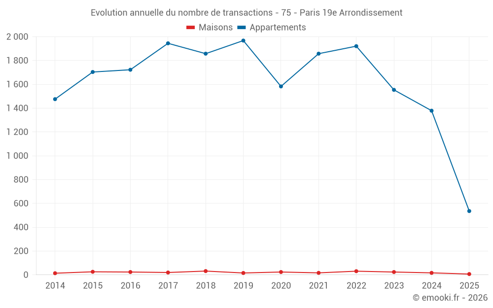 Le prix médian sur les 36 transactions de maisons des 24 derniers mois dans la commune de Paris 19e Arrondissement était de 12 524 € par mètre carré pour une valeur foncière médiane de 1 185 000 €. Sur cette période 60% des transactions se sont situées entre 9 173 et 15 517 € par mètre carré (du 2ème au 8ème déciles).