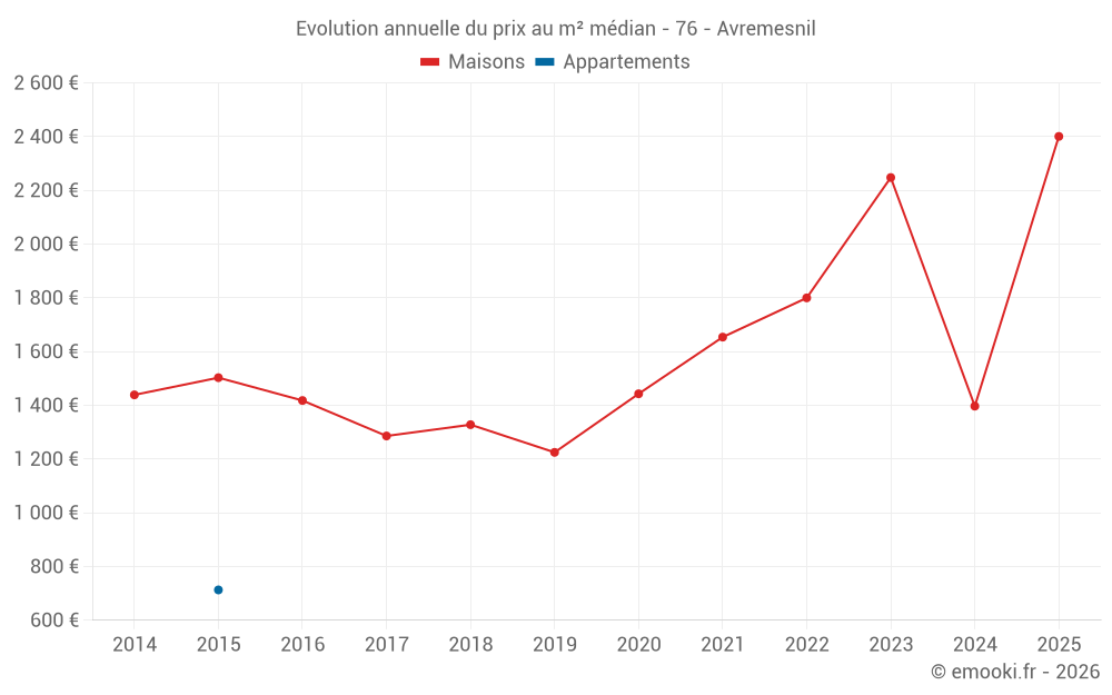 Le prix médian sur les 14 transactions de maisons des 24 derniers mois dans la commune d'Avremesnil était de 2 094 € par mètre carré pour une valeur foncière médiane de 173 200 €. Sur cette période 60% des transactions se sont situées entre 1 360 et 2 405 € par mètre carré (du 2ème au 8ème déciles).