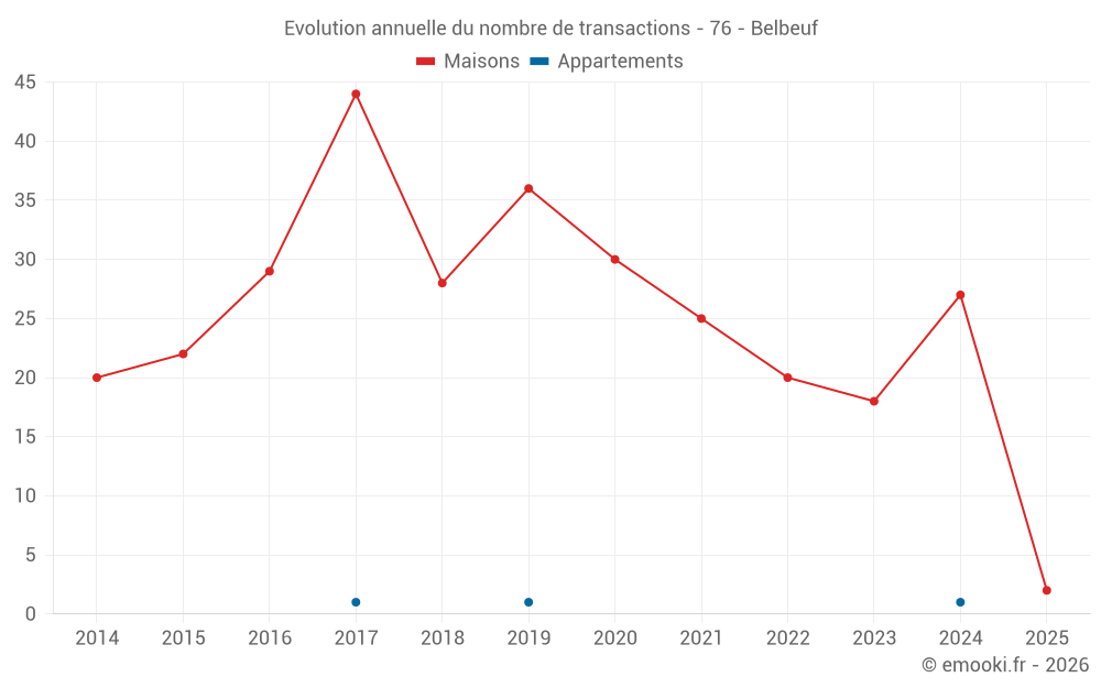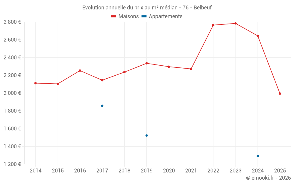 Le prix médian sur les 17 transactions de maisons des 12 derniers mois dans la commune de Belbeuf était de 2 423 € par mètre carré pour une valeur foncière médiane de 248 450 €. Sur cette période 60% des transactions se sont situées entre 2 025 et 3 158 € par mètre carré (du 2ème au 8ème déciles).