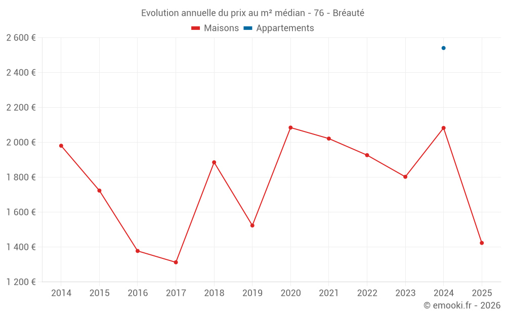 Le prix médian sur les 18 transactions de maisons des 24 derniers mois dans la commune de Bréauté était de 1 666 € par mètre carré pour une valeur foncière médiane de 144 100 €. Sur cette période 60% des transactions se sont situées entre 1 345 et 2 410 € par mètre carré (du 2ème au 8ème déciles).
