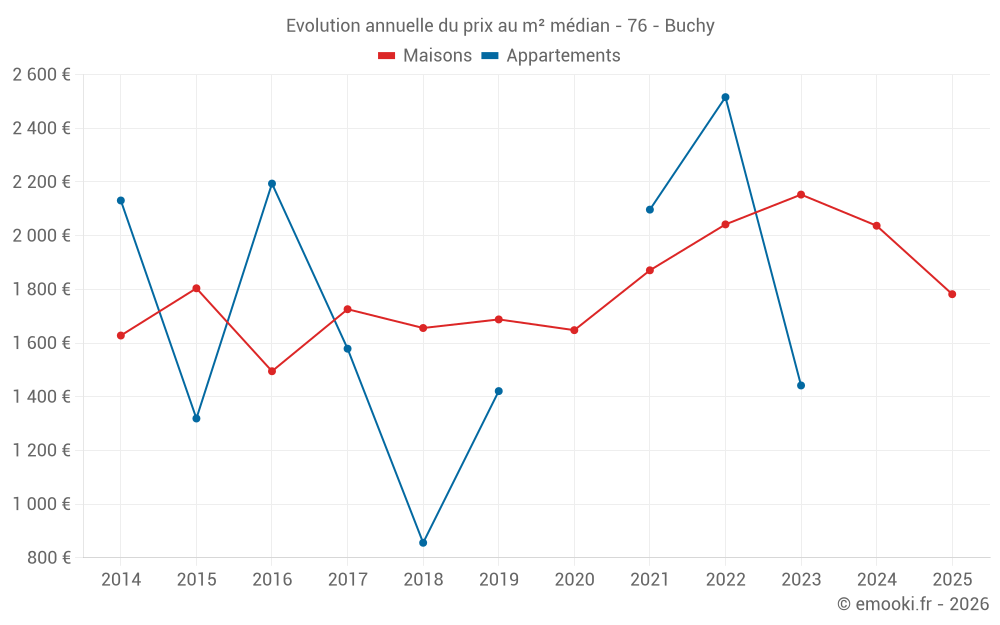 Le prix médian sur les 22 transactions de maisons des 12 derniers mois dans la commune de Buchy était de 1 895 € par mètre carré pour une valeur foncière médiane de 195 500 €. Sur cette période 60% des transactions se sont situées entre 1 377 et 2 865 € par mètre carré (du 2ème au 8ème déciles).