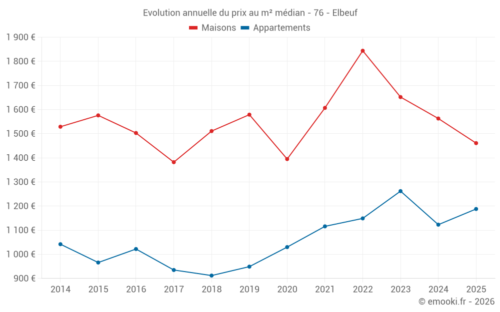 Le prix médian sur les 29 transactions de maisons des 6 derniers mois dans la commune d'Elbeuf était de 1 461 € par mètre carré pour une valeur foncière médiane de 129 300 €. Sur cette période 60% des transactions se sont situées entre 789 et 1 803 € par mètre carré (du 2ème au 8ème déciles).