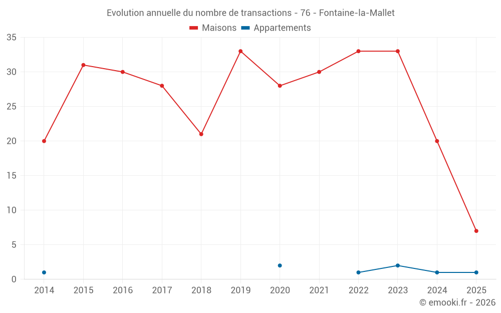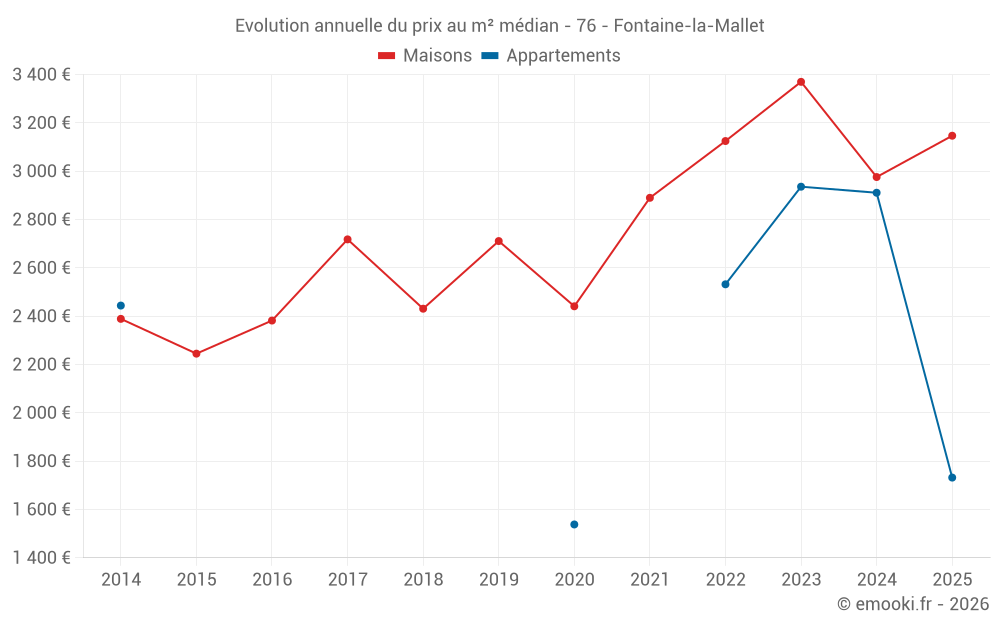 Le prix médian sur les 18 transactions de maisons des 12 derniers mois dans la commune de Fontaine-la-Mallet était de 3 118 € par mètre carré pour une valeur foncière médiane de 318 000 €. Sur cette période 60% des transactions se sont situées entre 2 517 et 3 692 € par mètre carré (du 2ème au 8ème déciles).