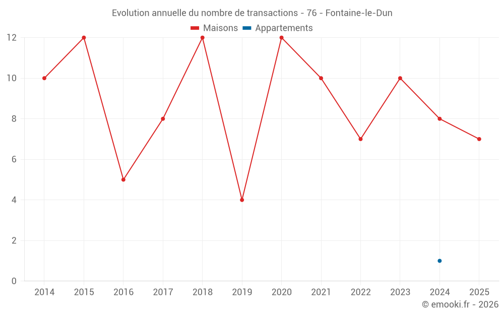 Le prix médian sur les 22 transactions de maisons des 24 derniers mois dans la commune de Fontaine-le-Dun était de 1 726 € par mètre carré pour une valeur foncière médiane de 160 000 €. Sur cette période 60% des transactions se sont situées entre 1 221 et 2 198 € par mètre carré (du 2ème au 8ème déciles).