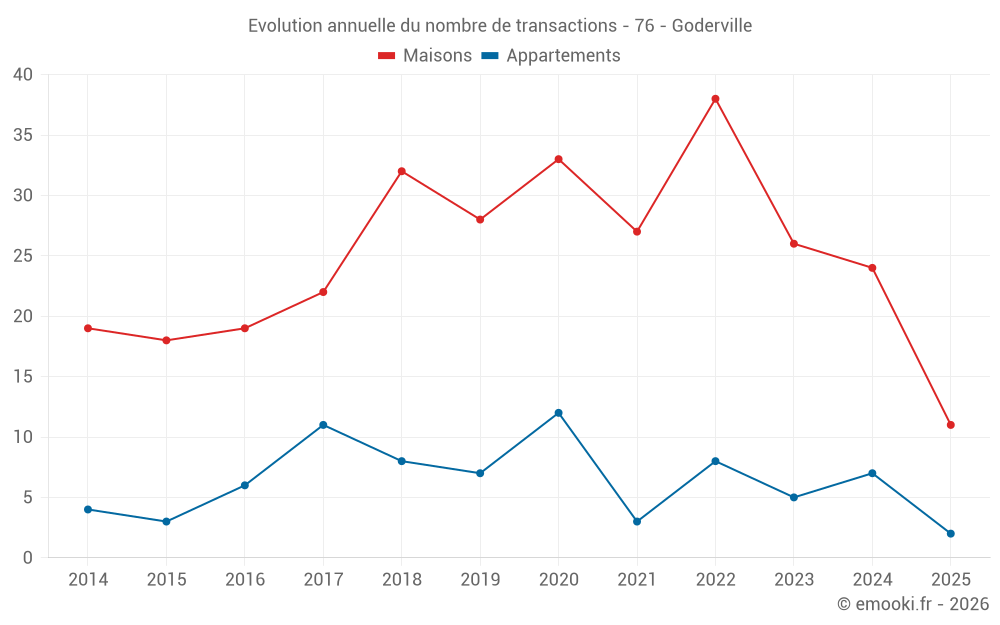 Le prix médian sur les 29 transactions de maisons des 12 derniers mois dans la commune de Goderville était de 2 190 € par mètre carré pour une valeur foncière médiane de 185 100 €. Sur cette période 60% des transactions se sont situées entre 1 862 et 2 602 € par mètre carré (du 2ème au 8ème déciles).