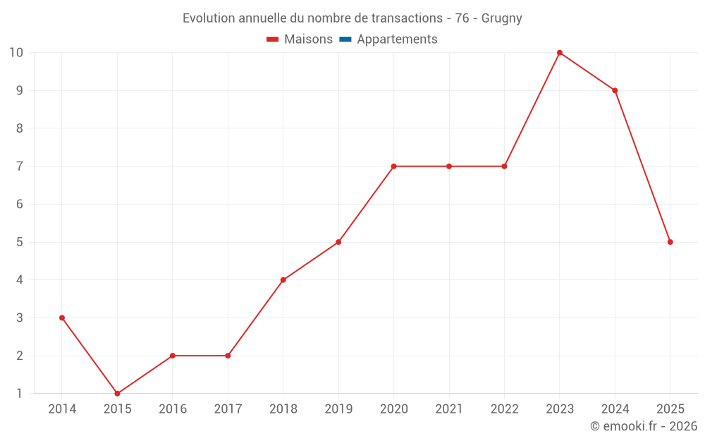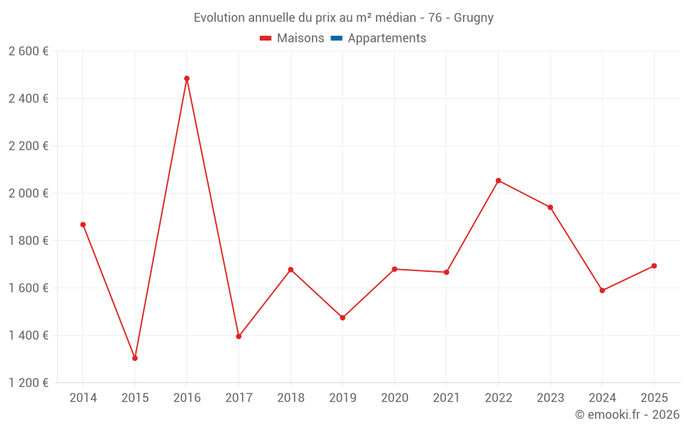 Le prix médian sur les 19 transactions de maisons des 24 derniers mois dans la commune de Grugny était de 1 797 € par mètre carré pour une valeur foncière médiane de 171 050 €. Sur cette période 60% des transactions se sont situées entre 1 349 et 2 173 € par mètre carré (du 2ème au 8ème déciles).