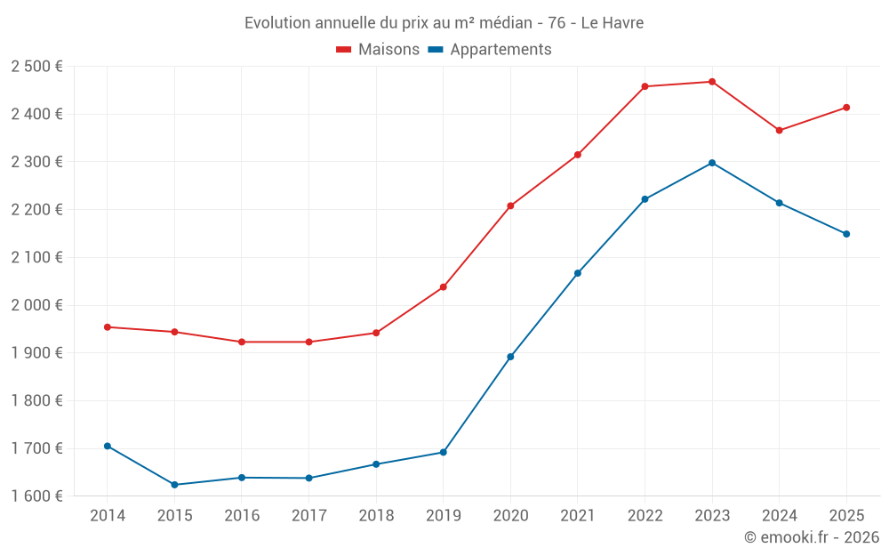 Le prix médian sur les 107 transactions de maisons des 3 derniers mois dans la commune du Havre était de 2 300 € par mètre carré pour une valeur foncière médiane de 203 000 €. Sur cette période 60% des transactions se sont situées entre 1 911 et 3 228 € par mètre carré (du 2ème au 8ème déciles).
