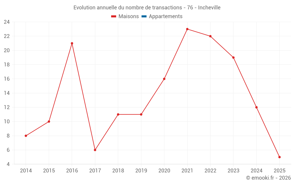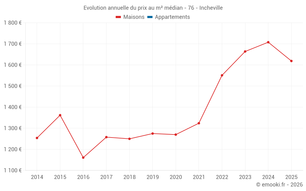 Le prix médian sur les 25 transactions de maisons des 24 derniers mois dans la commune d'Incheville était de 1 722 € par mètre carré pour une valeur foncière médiane de 132 000 €. Sur cette période 60% des transactions se sont situées entre 961 et 2 275 € par mètre carré (du 2ème au 8ème déciles).