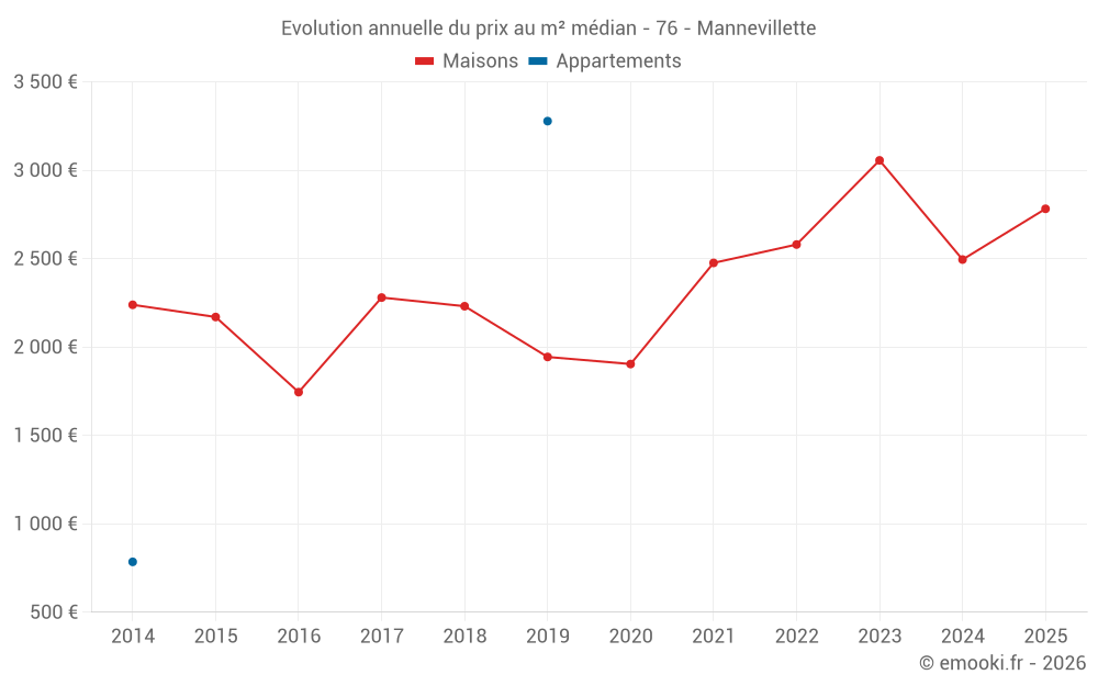 Le prix médian sur les 14 transactions de maisons des 24 derniers mois dans la commune de Mannevillette était de 2 474 € par mètre carré pour une valeur foncière médiane de 253 850 €. Sur cette période 60% des transactions se sont situées entre 2 107 et 3 110 € par mètre carré (du 2ème au 8ème déciles).