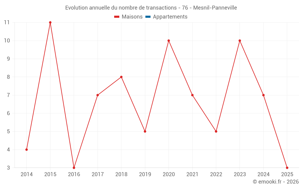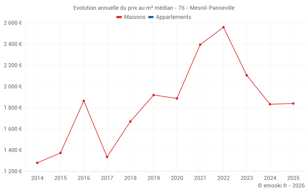Le prix médian sur les 16 transactions de maisons des 24 derniers mois dans la commune de Mesnil-Panneville était de 1 884 € par mètre carré pour une valeur foncière médiane de 210 500 €. Sur cette période 60% des transactions se sont situées entre 1 667 et 2 263 € par mètre carré (du 2ème au 8ème déciles).