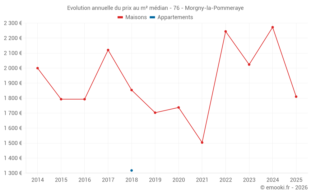 Le prix médian sur les 28 transactions de maisons des 24 derniers mois dans la commune de Morgny-la-Pommeraye était de 2 075 € par mètre carré pour une valeur foncière médiane de 219 800 €. Sur cette période 60% des transactions se sont situées entre 1 816 et 2 410 € par mètre carré (du 2ème au 8ème déciles).