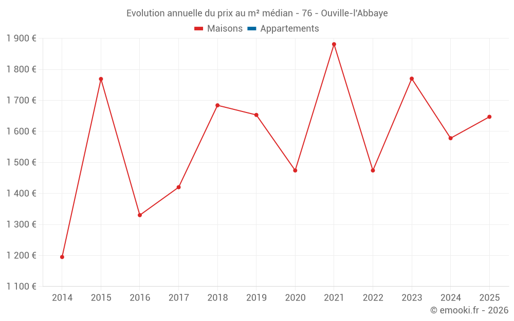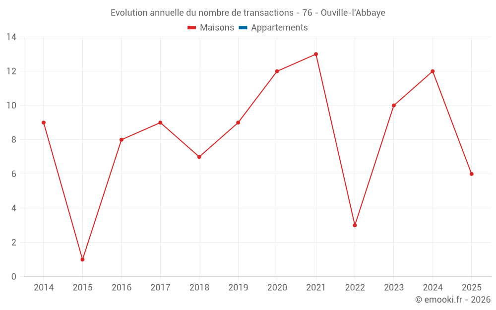 Le prix médian sur les 16 transactions de maisons des 12 derniers mois dans la commune d'Ouville-l'Abbaye était de 1 578 € par mètre carré pour une valeur foncière médiane de 175 750 €. Sur cette période 60% des transactions se sont situées entre 1 275 et 2 011 € par mètre carré (du 2ème au 8ème déciles).