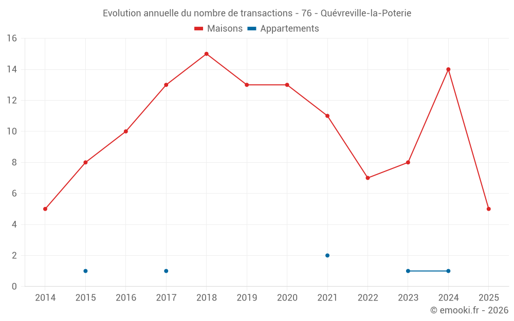 Le prix médian sur les 20 transactions de maisons des 24 derniers mois dans la commune de Quévreville-la-Poterie était de 2 078 € par mètre carré pour une valeur foncière médiane de 221 050 €. Sur cette période 60% des transactions se sont situées entre 1 566 et 2 598 € par mètre carré (du 2ème au 8ème déciles).