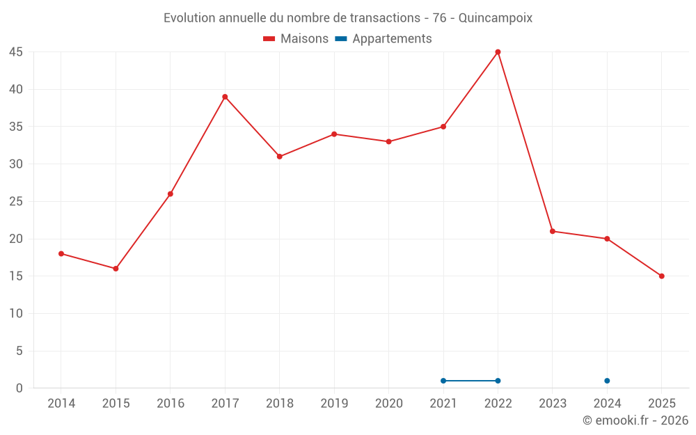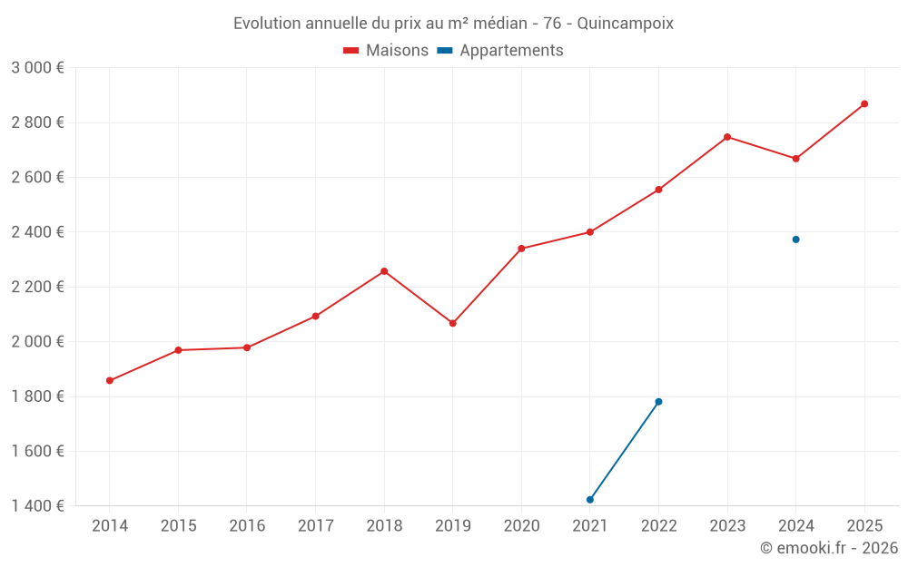 Le prix médian sur les 25 transactions de maisons des 12 derniers mois dans la commune de Quincampoix était de 2 846 € par mètre carré pour une valeur foncière médiane de 337 800 €. Sur cette période 60% des transactions se sont situées entre 2 310 et 3 172 € par mètre carré (du 2ème au 8ème déciles).