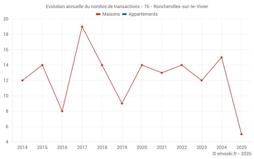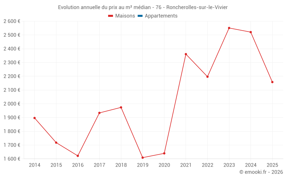 Le prix médian sur les 26 transactions de maisons des 24 derniers mois dans la commune de Roncherolles-sur-le-Vivier était de 2 406 € par mètre carré pour une valeur foncière médiane de 243 000 €. Sur cette période 60% des transactions se sont situées entre 1 846 et 2 678 € par mètre carré (du 2ème au 8ème déciles).