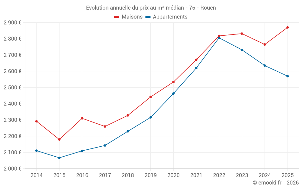 Le prix médian sur les 56 transactions de maisons des 3 derniers mois dans la commune de Rouen était de 2 914 € par mètre carré pour une valeur foncière médiane de 265 775 €. Sur cette période 60% des transactions se sont situées entre 2 000 et 3 694 € par mètre carré (du 2ème au 8ème déciles).