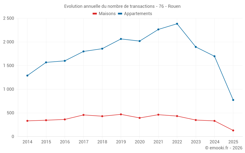 Le prix médian sur les 339 transactions d'appartements des 3 derniers mois dans la commune de Rouen était de 2 523 € par mètre carré pour une valeur foncière médiane de 108 232 €. Sur cette période 60% des transactions se sont situées entre 1 874 et 3 375 € par mètre carré (du 2ème au 8ème déciles).