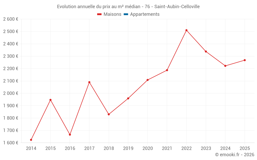 Le prix médian sur les 16 transactions de maisons des 12 derniers mois dans la commune de Saint-Aubin-Celloville était de 2 232 € par mètre carré pour une valeur foncière médiane de 233 000 €. Sur cette période 60% des transactions se sont situées entre 2 000 et 2 679 € par mètre carré (du 2ème au 8ème déciles).