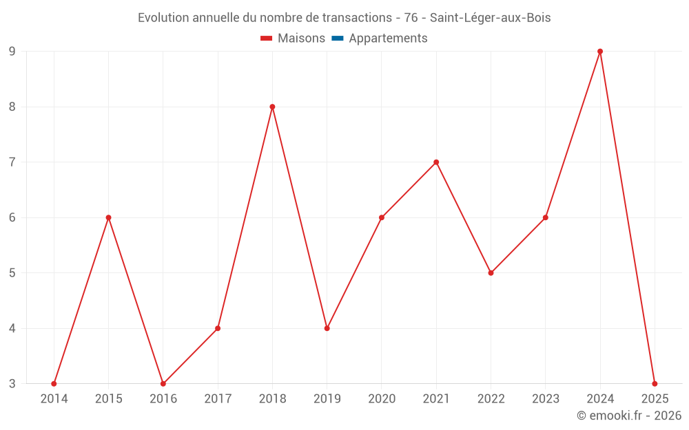 Le prix médian sur les 14 transactions de maisons des 24 derniers mois dans la commune de Saint-Léger-aux-Bois était de 1 284 € par mètre carré pour une valeur foncière médiane de 112 700 €. Sur cette période 60% des transactions se sont situées entre 785 et 1 757 € par mètre carré (du 2ème au 8ème déciles).