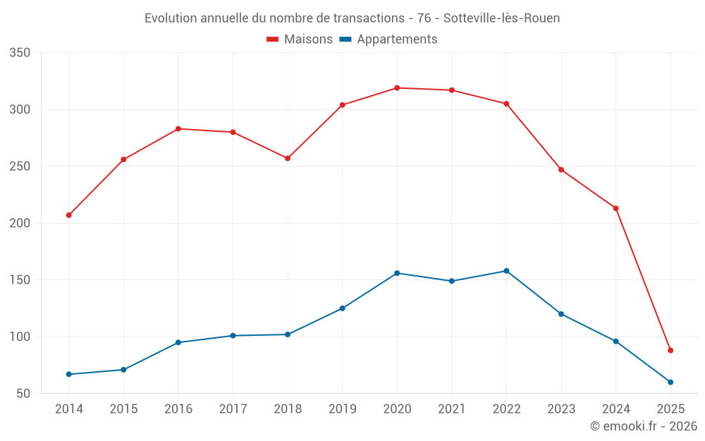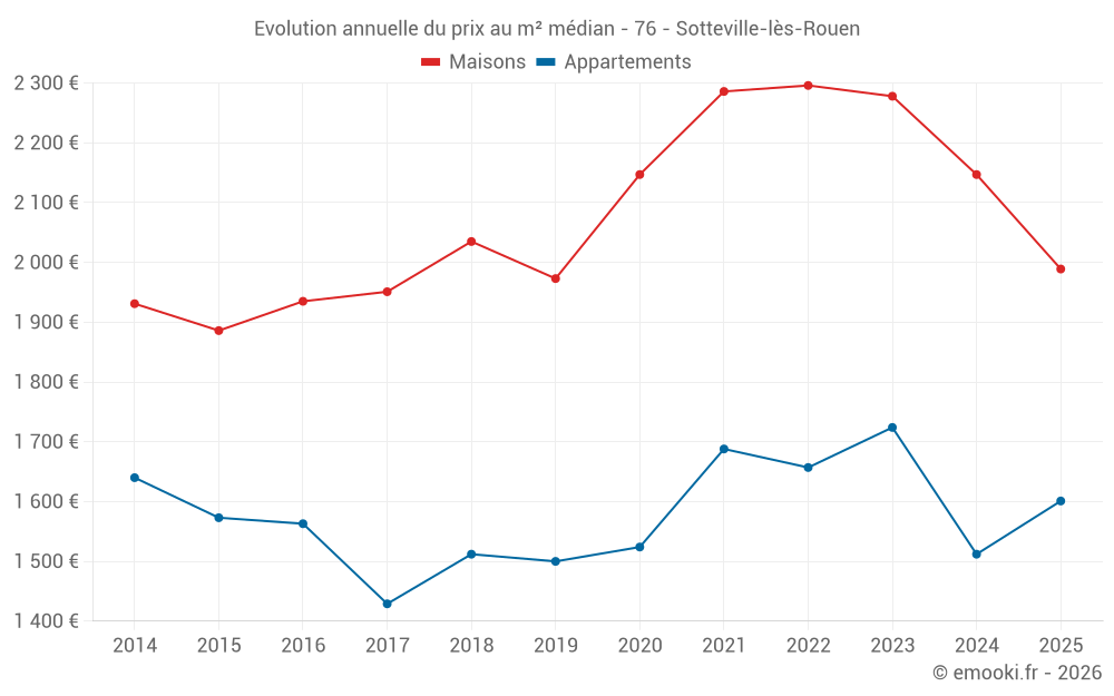 Le prix médian sur les 46 transactions de maisons des 3 derniers mois dans la commune de Sotteville-lès-Rouen était de 1 864 € par mètre carré pour une valeur foncière médiane de 148 500 €. Sur cette période 60% des transactions se sont situées entre 1 472 et 2 386 € par mètre carré (du 2ème au 8ème déciles).
