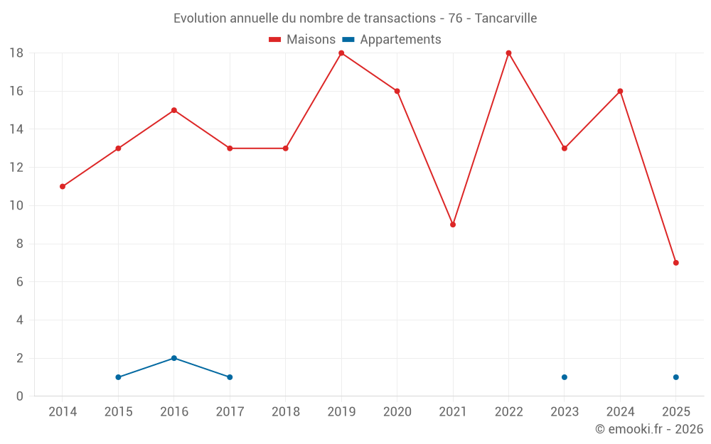 Le prix médian sur les 31 transactions de maisons des 24 derniers mois dans la commune de Tancarville était de 1 966 € par mètre carré pour une valeur foncière médiane de 175 000 €. Sur cette période 60% des transactions se sont situées entre 1 375 et 2 467 € par mètre carré (du 2ème au 8ème déciles).