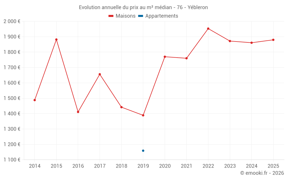 Le prix médian sur les 23 transactions de maisons des 24 derniers mois dans la commune d'Yébleron était de 1 922 € par mètre carré pour une valeur foncière médiane de 160 000 €. Sur cette période 60% des transactions se sont situées entre 1 166 et 2 378 € par mètre carré (du 2ème au 8ème déciles).