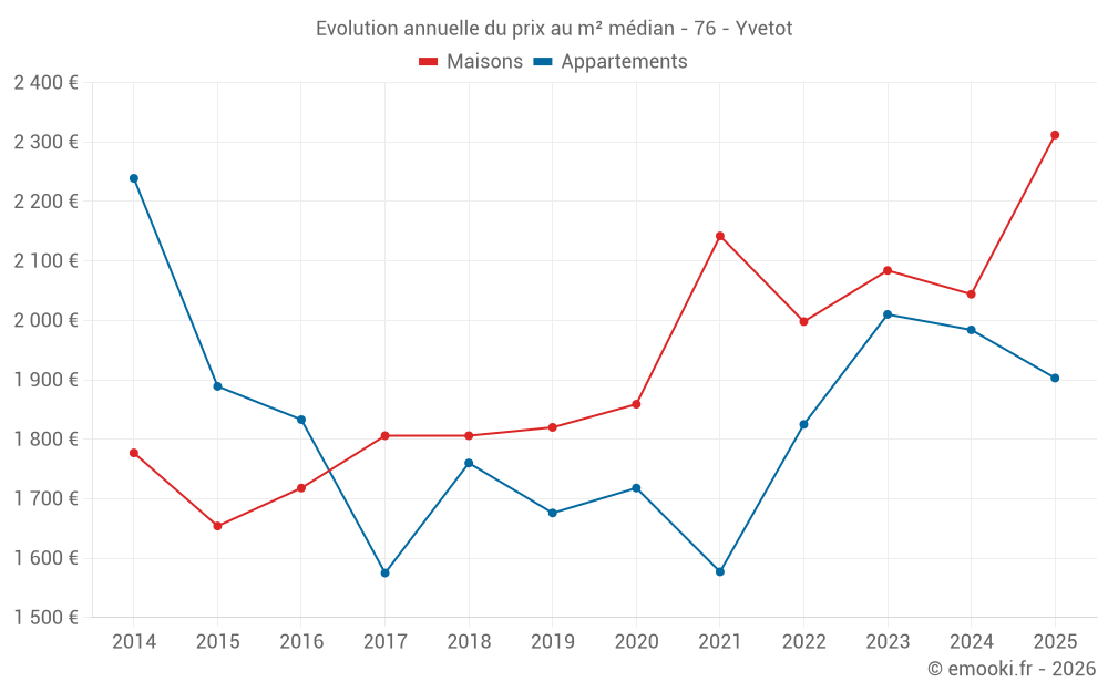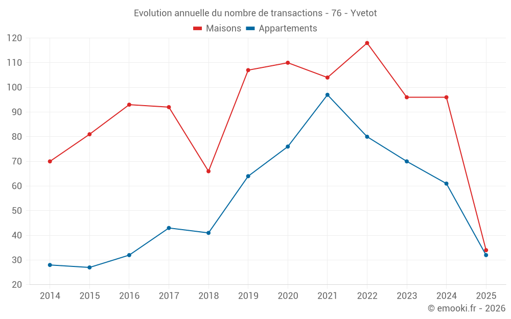 Le prix médian sur les 23 transactions de maisons des 3 derniers mois dans la commune d'Yvetot était de 2 343 € par mètre carré pour une valeur foncière médiane de 205 000 €. Sur cette période 60% des transactions se sont situées entre 1 611 et 2 558 € par mètre carré (du 2ème au 8ème déciles).