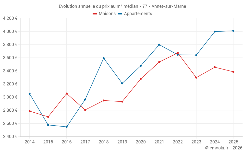 Le prix médian sur les 20 transactions d'appartements des 24 derniers mois dans la commune d'Annet-sur-Marne était de 3 997 € par mètre carré pour une valeur foncière médiane de 170 635 €. Sur cette période 60% des transactions se sont situées entre 3 451 et 4 423 € par mètre carré (du 2ème au 8ème déciles).