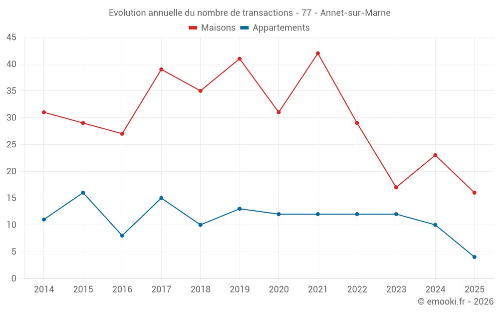 Le prix médian sur les 29 transactions de maisons des 12 derniers mois dans la commune d'Annet-sur-Marne était de 3 413 € par mètre carré pour une valeur foncière médiane de 360 000 €. Sur cette période 60% des transactions se sont situées entre 2 521 et 3 893 € par mètre carré (du 2ème au 8ème déciles).
