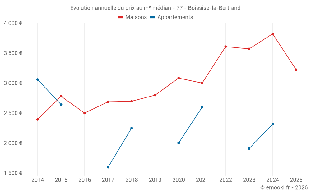 Le prix médian sur les 18 transactions de maisons des 24 derniers mois dans la commune de Boissise-la-Bertrand était de 3 722 € par mètre carré pour une valeur foncière médiane de 335 000 €. Sur cette période 60% des transactions se sont situées entre 2 890 et 4 285 € par mètre carré (du 2ème au 8ème déciles).