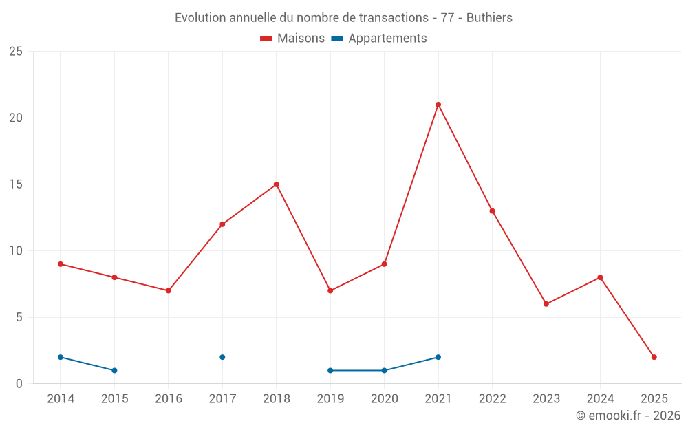 Le prix médian sur les 14 transactions de maisons des 24 derniers mois dans la commune de Buthiers était de 2 292 € par mètre carré pour une valeur foncière médiane de 196 500 €. Sur cette période 60% des transactions se sont situées entre 1 509 et 2 740 € par mètre carré (du 2ème au 8ème déciles).