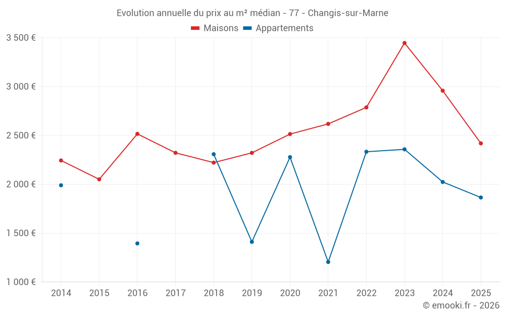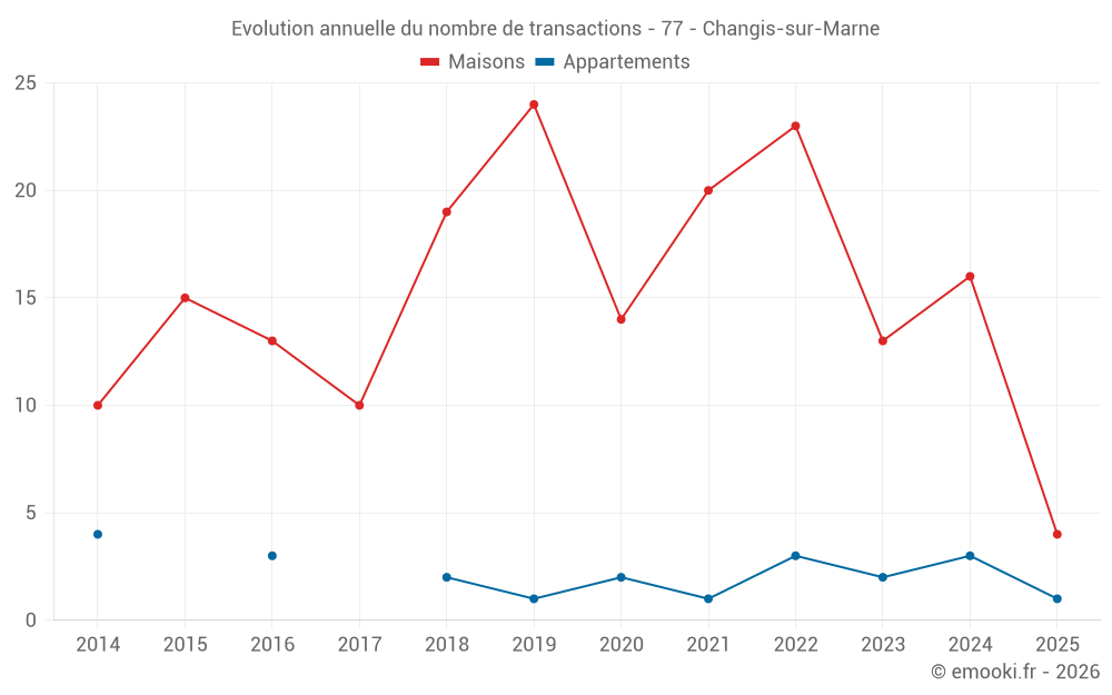 Le prix médian sur les 25 transactions de maisons des 24 derniers mois dans la commune de Changis-sur-Marne était de 3 053 € par mètre carré pour une valeur foncière médiane de 244 000 €. Sur cette période 60% des transactions se sont situées entre 2 032 et 3 655 € par mètre carré (du 2ème au 8ème déciles).