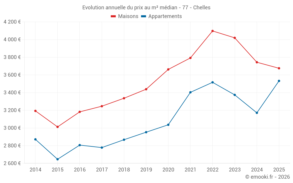 Le prix médian sur les 21 transactions de maisons des 3 derniers mois dans la commune de Chelles était de 3 443 € par mètre carré pour une valeur foncière médiane de 330 000 €. Sur cette période 60% des transactions se sont situées entre 3 091 et 4 429 € par mètre carré (du 2ème au 8ème déciles).