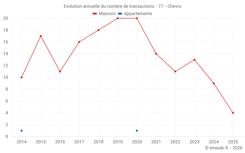 Le prix médian sur les 19 transactions de maisons des 24 derniers mois dans la commune de Chevru était de 1 792 € par mètre carré pour une valeur foncière médiane de 227 100 €. Sur cette période 60% des transactions se sont situées entre 1 254 et 2 302 € par mètre carré (du 2ème au 8ème déciles).