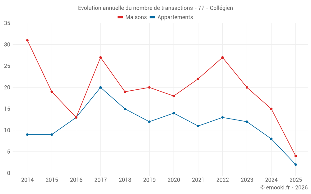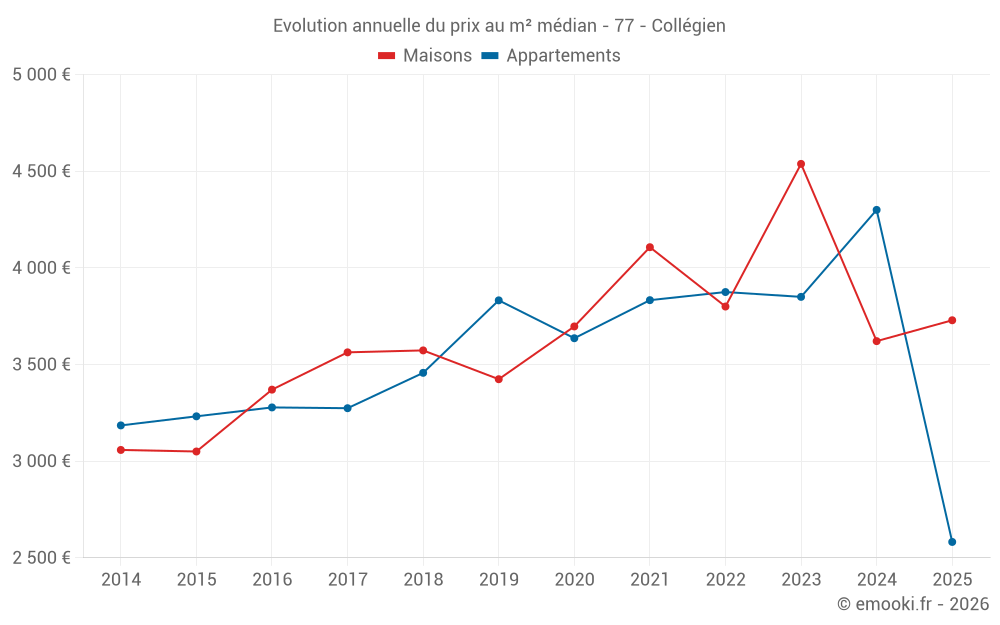 Le prix médian sur les 31 transactions de maisons des 24 derniers mois dans la commune de Collégien était de 4 023 € par mètre carré pour une valeur foncière médiane de 399 000 €. Sur cette période 60% des transactions se sont situées entre 3 333 et 4 717 € par mètre carré (du 2ème au 8ème déciles).