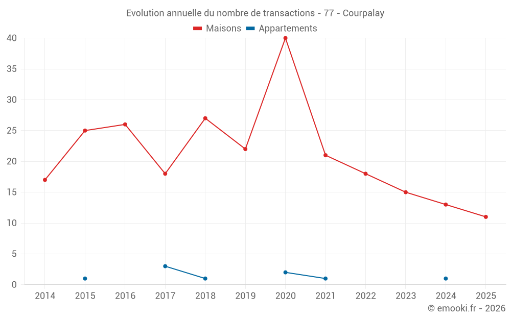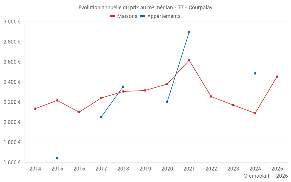 Le prix médian sur les 31 transactions de maisons des 24 derniers mois dans la commune de Courpalay était de 2 229 € par mètre carré pour une valeur foncière médiane de 225 000 €. Sur cette période 60% des transactions se sont situées entre 1 598 et 2 776 € par mètre carré (du 2ème au 8ème déciles).