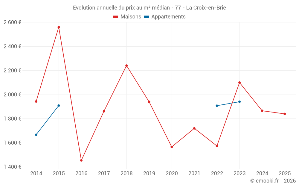 Le prix médian sur les 18 transactions de maisons des 24 derniers mois dans la commune de la Croix-en-Brie était de 1 972 € par mètre carré pour une valeur foncière médiane de 167 500 €. Sur cette période 60% des transactions se sont situées entre 1 695 et 2 672 € par mètre carré (du 2ème au 8ème déciles).