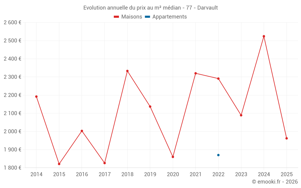 Le prix médian sur les 22 transactions de maisons des 24 derniers mois dans la commune de Darvault était de 2 089 € par mètre carré pour une valeur foncière médiane de 168 000 €. Sur cette période 60% des transactions se sont situées entre 1 440 et 2 606 € par mètre carré (du 2ème au 8ème déciles).