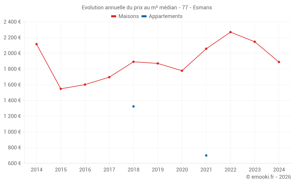 Le prix médian sur les 16 transactions de maisons des 24 derniers mois dans la commune d'Esmans était de 2 018 € par mètre carré pour une valeur foncière médiane de 164 000 €. Sur cette période 60% des transactions se sont situées entre 1 500 et 2 810 € par mètre carré (du 2ème au 8ème déciles).