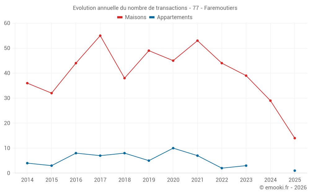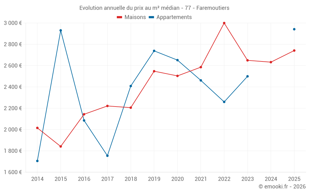 Le prix médian sur les 34 transactions de maisons des 12 derniers mois dans la commune de Faremoutiers était de 2 608 € par mètre carré pour une valeur foncière médiane de 268 500 €. Sur cette période 60% des transactions se sont situées entre 1 980 et 3 237 € par mètre carré (du 2ème au 8ème déciles).