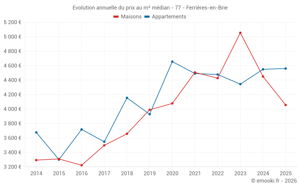 Le prix médian sur les 28 transactions de maisons des 24 derniers mois dans la commune de Ferrières-en-Brie était de 4 674 € par mètre carré pour une valeur foncière médiane de 457 000 €. Sur cette période 60% des transactions se sont situées entre 3 422 et 5 103 € par mètre carré (du 2ème au 8ème déciles).