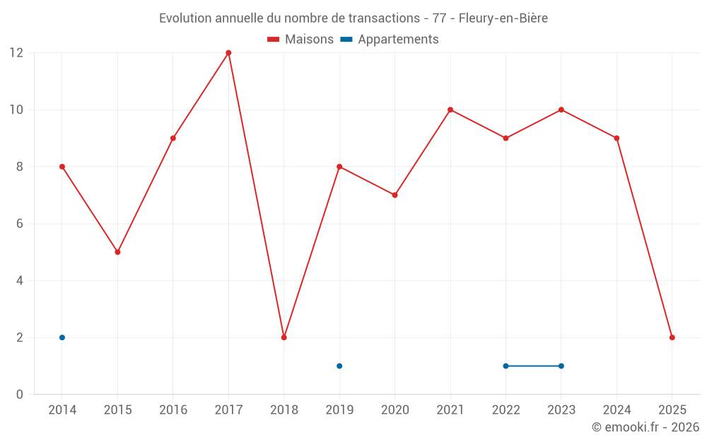 Le prix médian sur les 16 transactions de maisons des 24 derniers mois dans la commune de Fleury-en-Bière était de 3 960 € par mètre carré pour une valeur foncière médiane de 359 500 €. Sur cette période 60% des transactions se sont situées entre 2 500 et 5 714 € par mètre carré (du 2ème au 8ème déciles).