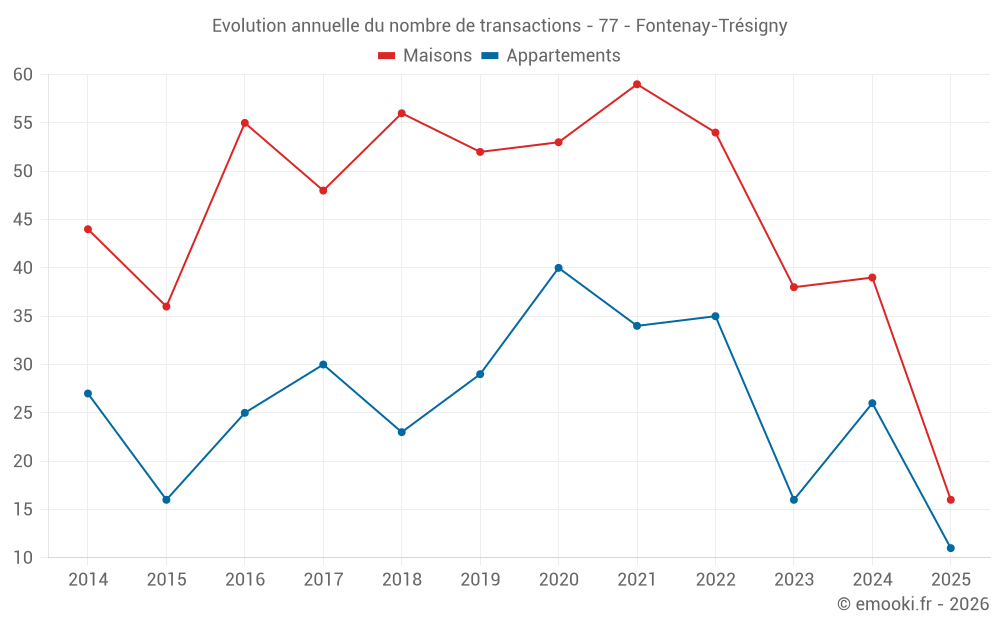 Le prix médian sur les 39 transactions de maisons des 12 derniers mois dans la commune de Fontenay-Trésigny était de 2 780 € par mètre carré pour une valeur foncière médiane de 278 000 €. Sur cette période 60% des transactions se sont situées entre 2 324 et 3 196 € par mètre carré (du 2ème au 8ème déciles).