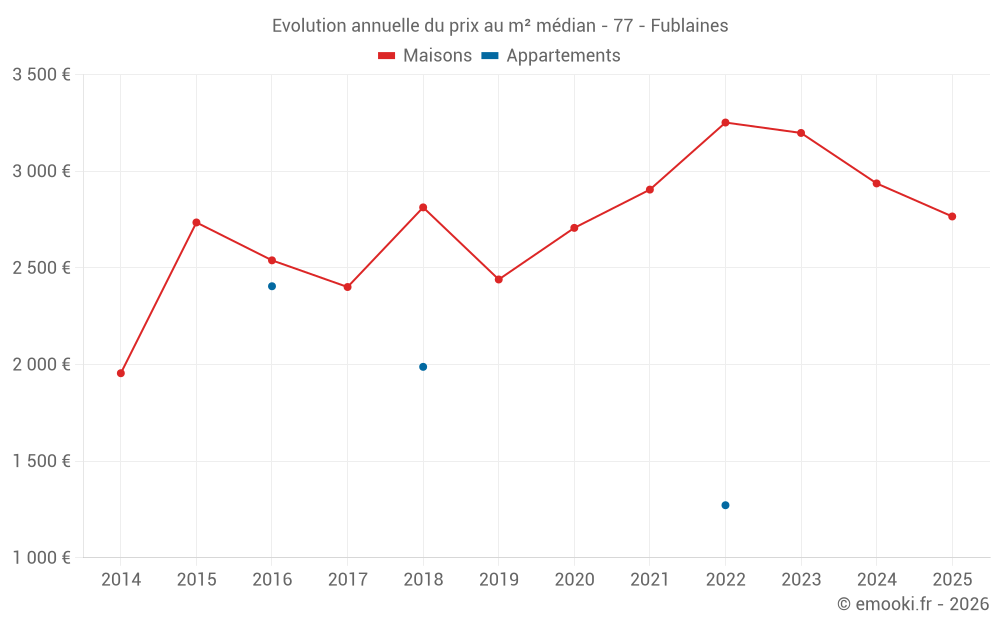 Le prix médian sur les 24 transactions de maisons des 24 derniers mois dans la commune de Fublaines était de 2 852 € par mètre carré pour une valeur foncière médiane de 268 500 €. Sur cette période 60% des transactions se sont situées entre 2 448 et 3 452 € par mètre carré (du 2ème au 8ème déciles).