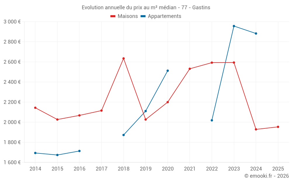 Le prix médian sur les 17 transactions de maisons des 24 derniers mois dans la commune de Gastins était de 2 100 € par mètre carré pour une valeur foncière médiane de 245 000 €. Sur cette période 60% des transactions se sont situées entre 1 644 et 2 717 € par mètre carré (du 2ème au 8ème déciles).