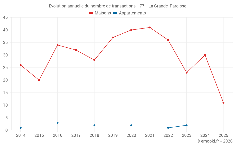 Le prix médian sur les 33 transactions de maisons des 12 derniers mois dans la commune de la Grande-Paroisse était de 2 202 € par mètre carré pour une valeur foncière médiane de 228 000 €. Sur cette période 60% des transactions se sont situées entre 1 522 et 2 562 € par mètre carré (du 2ème au 8ème déciles).
