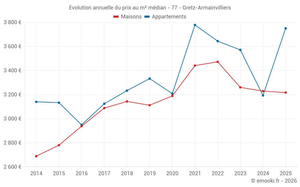 Le prix médian sur les 20 transactions de maisons des 6 derniers mois dans la commune de Gretz-Armainvilliers était de 3 217 € par mètre carré pour une valeur foncière médiane de 291 350 €. Sur cette période 60% des transactions se sont situées entre 2 627 et 3 564 € par mètre carré (du 2ème au 8ème déciles).