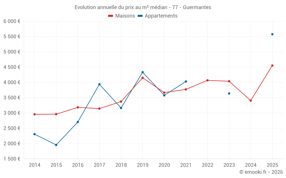 Le prix médian sur les 21 transactions de maisons des 24 derniers mois dans la commune de Guermantes était de 3 731 € par mètre carré pour une valeur foncière médiane de 428 000 €. Sur cette période 60% des transactions se sont situées entre 3 179 et 4 063 € par mètre carré (du 2ème au 8ème déciles).