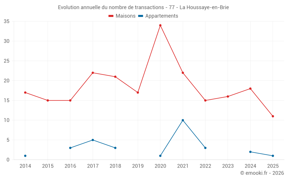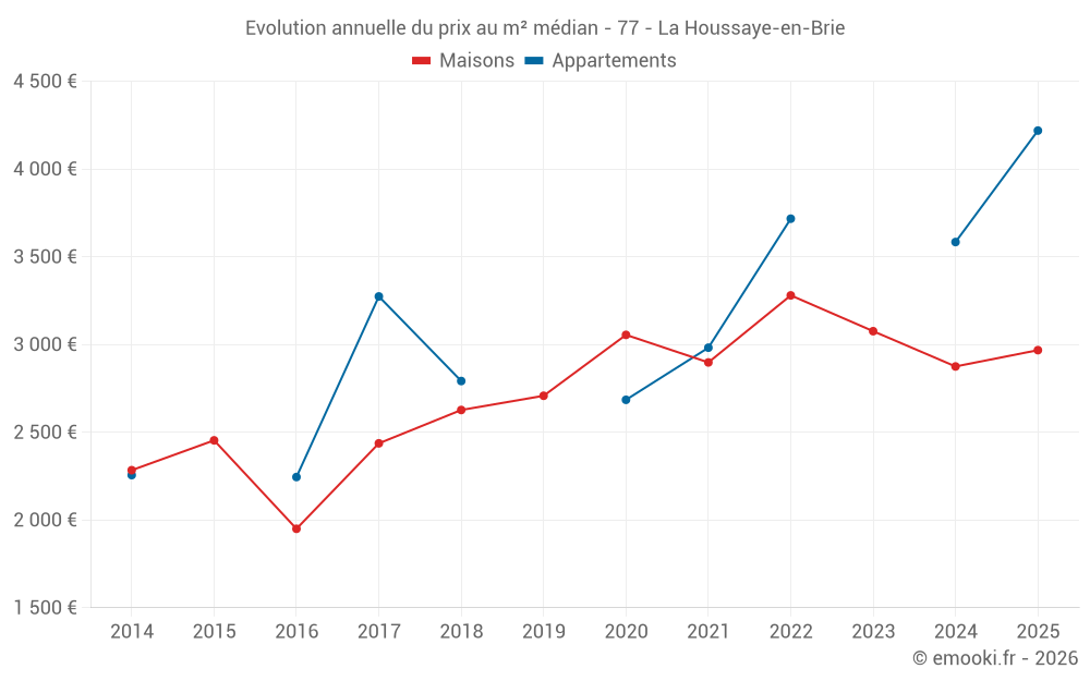 Le prix médian sur les 18 transactions de maisons des 12 derniers mois dans la commune de la Houssaye-en-Brie était de 3 046 € par mètre carré pour une valeur foncière médiane de 314 950 €. Sur cette période 60% des transactions se sont situées entre 2 317 et 3 521 € par mètre carré (du 2ème au 8ème déciles).